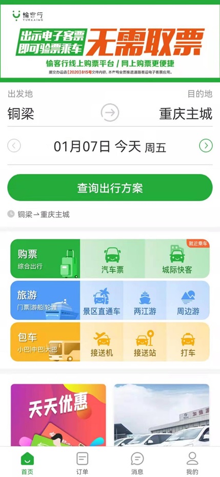 愉客行致力于服务公众出行,提供了汽车票、城际快客、车站接送、机场专线、景区直通车、重庆周边游、旅游包车、两江游、出租车、网约车等线上服务产品,全面覆盖道路出行领域,为政府科学决策和行业精准监管提供保障,为用户提供一站式出行解决方案,为市民提供定制化、个性化、智慧化、品质化的出行服务。